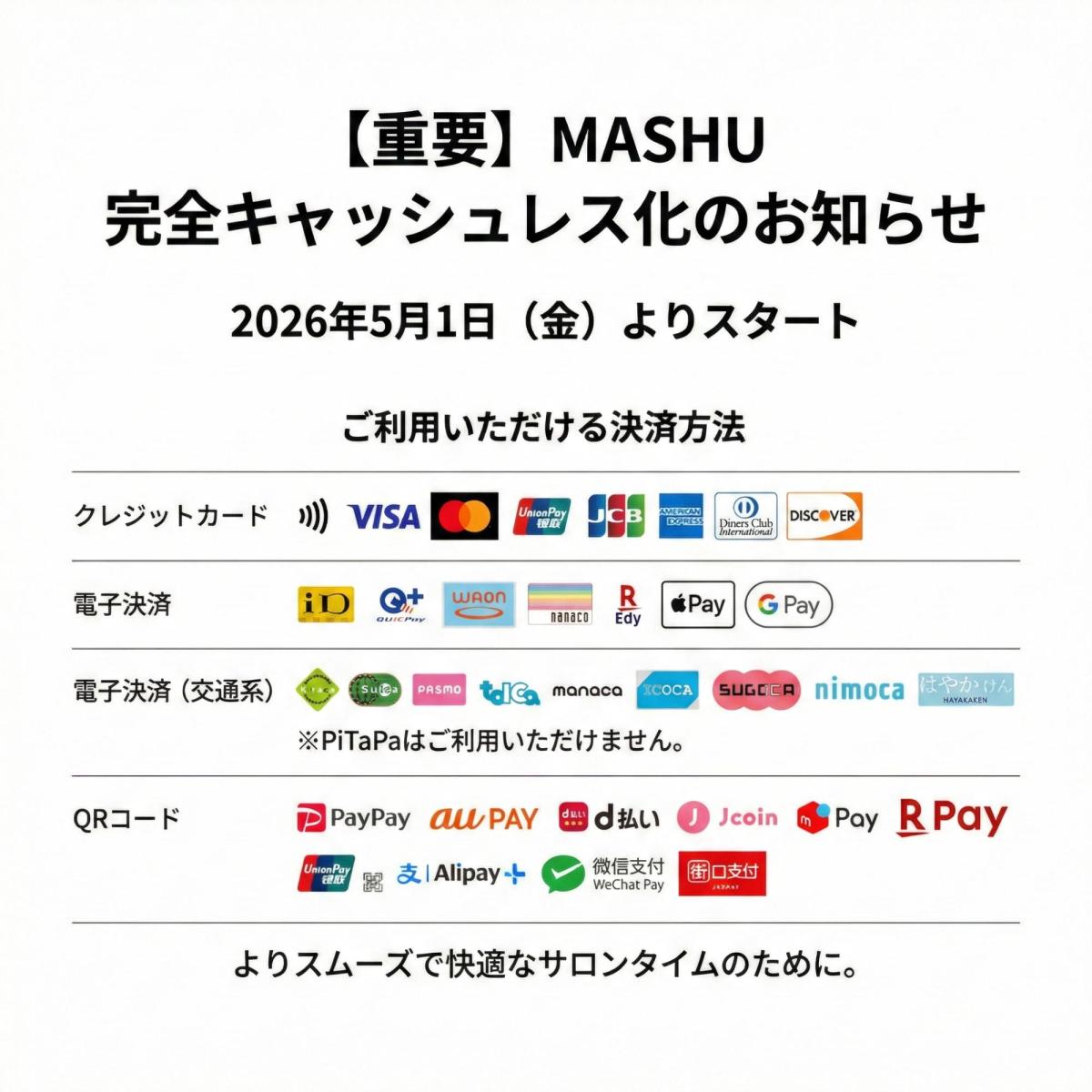 【重要なお知らせ】 2026年5月1日より「完全キャッシュレス決済」へ移行いたします