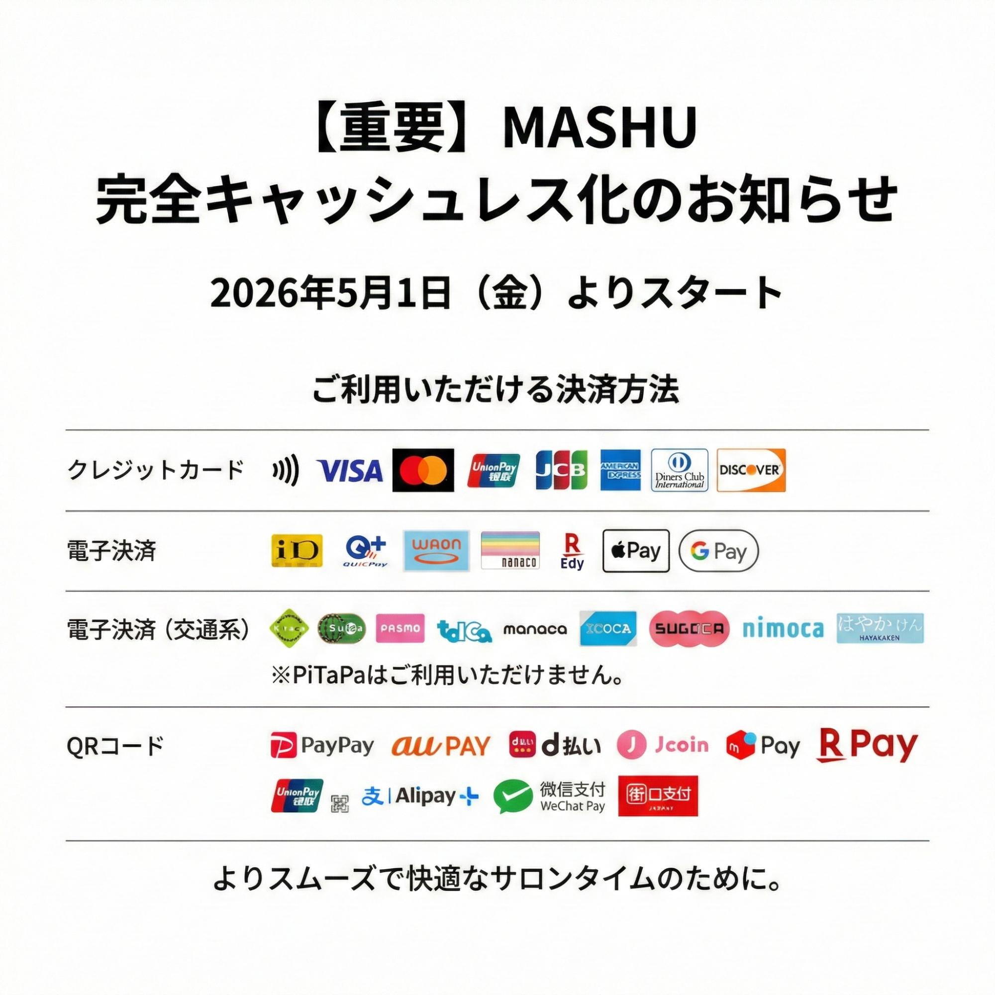 近年、大阪・関西万博をはじめ社会全体でキャッシュレス化が加速する中、MASHUでもお会計時の待ち時間短縮や混雑緩和を図り、お客様の大切な時間をより心地よくお過ごしいただきたいと考えております。